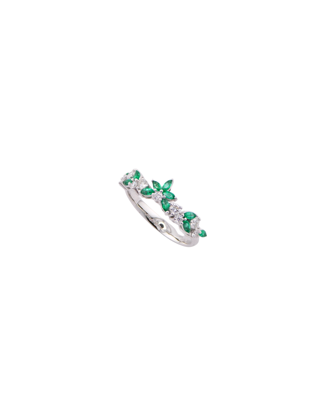 Anello in oro bianco 18Kt. Con smeraldi naturali taglio Marquise e diamanti taglio brillante